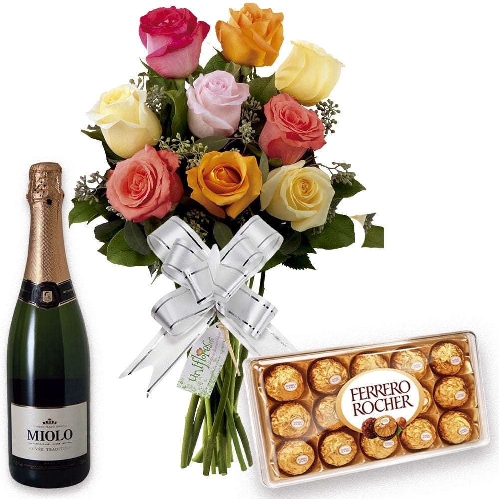 Buquê de Rosas Coloridas com Ferrero Rocher e Espumante